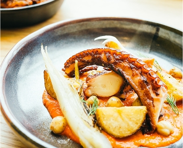 Tentáculo entero, marcado al carbón, con aceite de pimentón y patata rota.