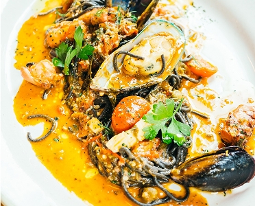 Langostinos, almejas y mejillones en fondo de caldo concentrado y pan tostado.