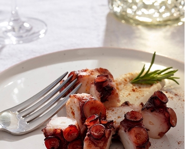 Tentáculo entero, marcado al carbón, con aceite de pimentón y patata rota.